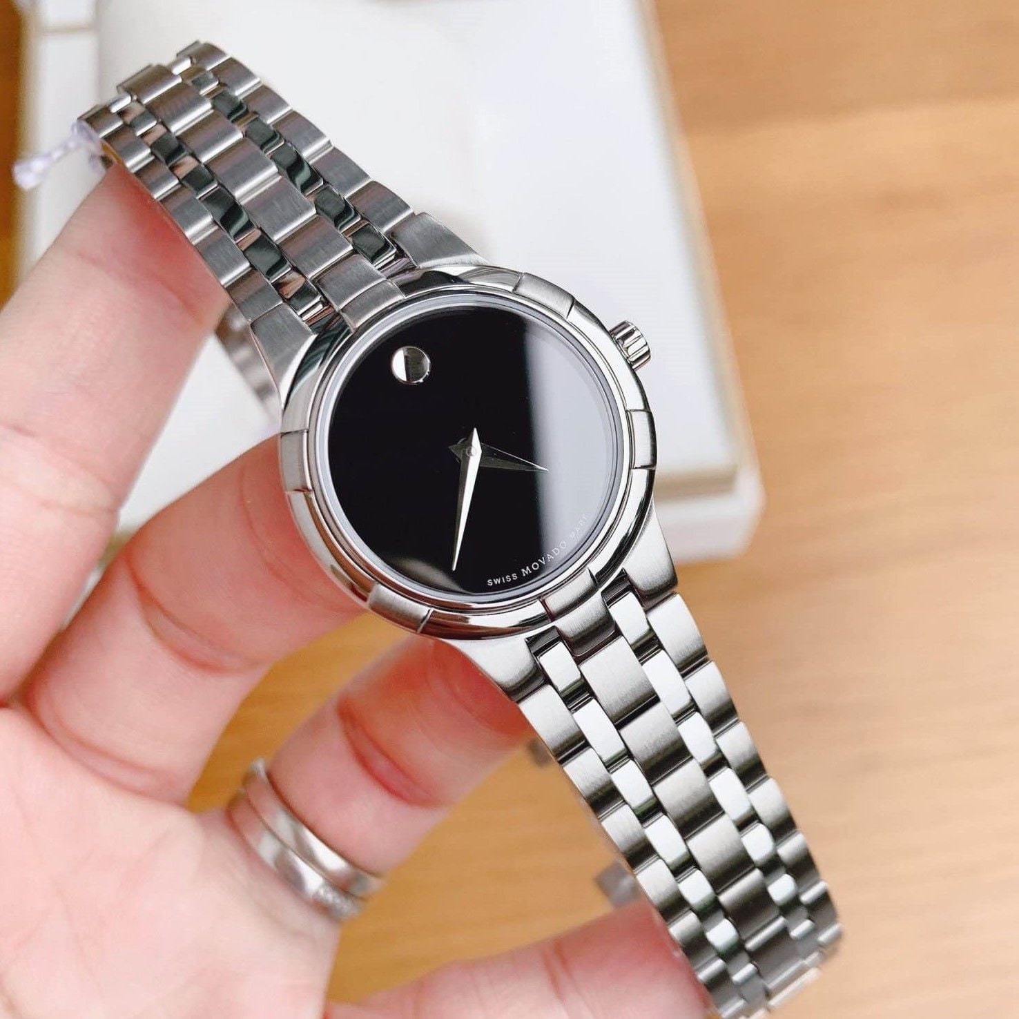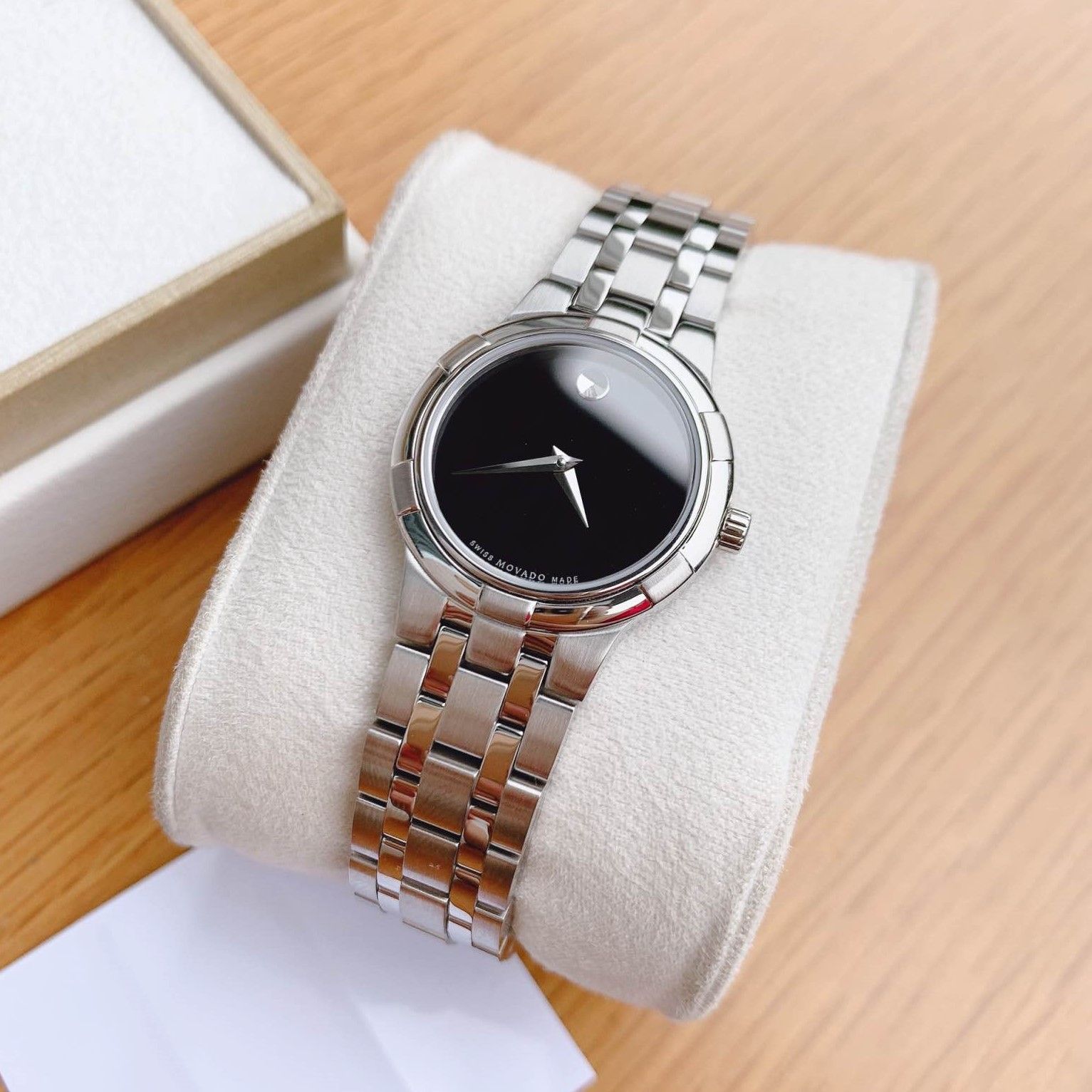 Đồng hồ Mo.va.do kim loại thép không gỉ , mặt số Đen kim số silver.