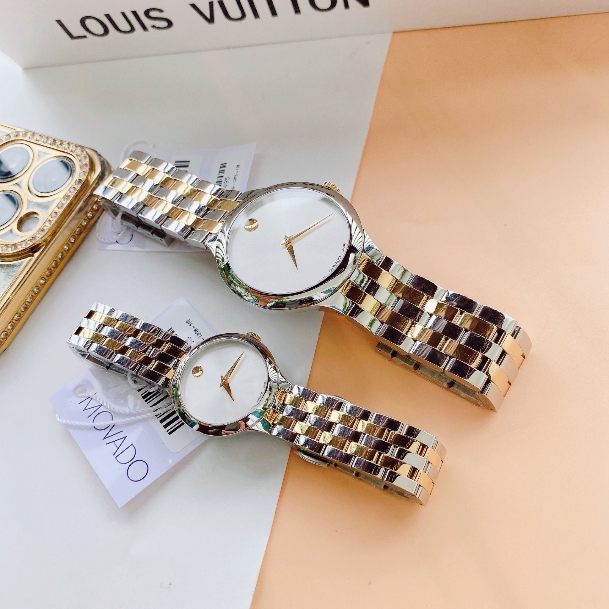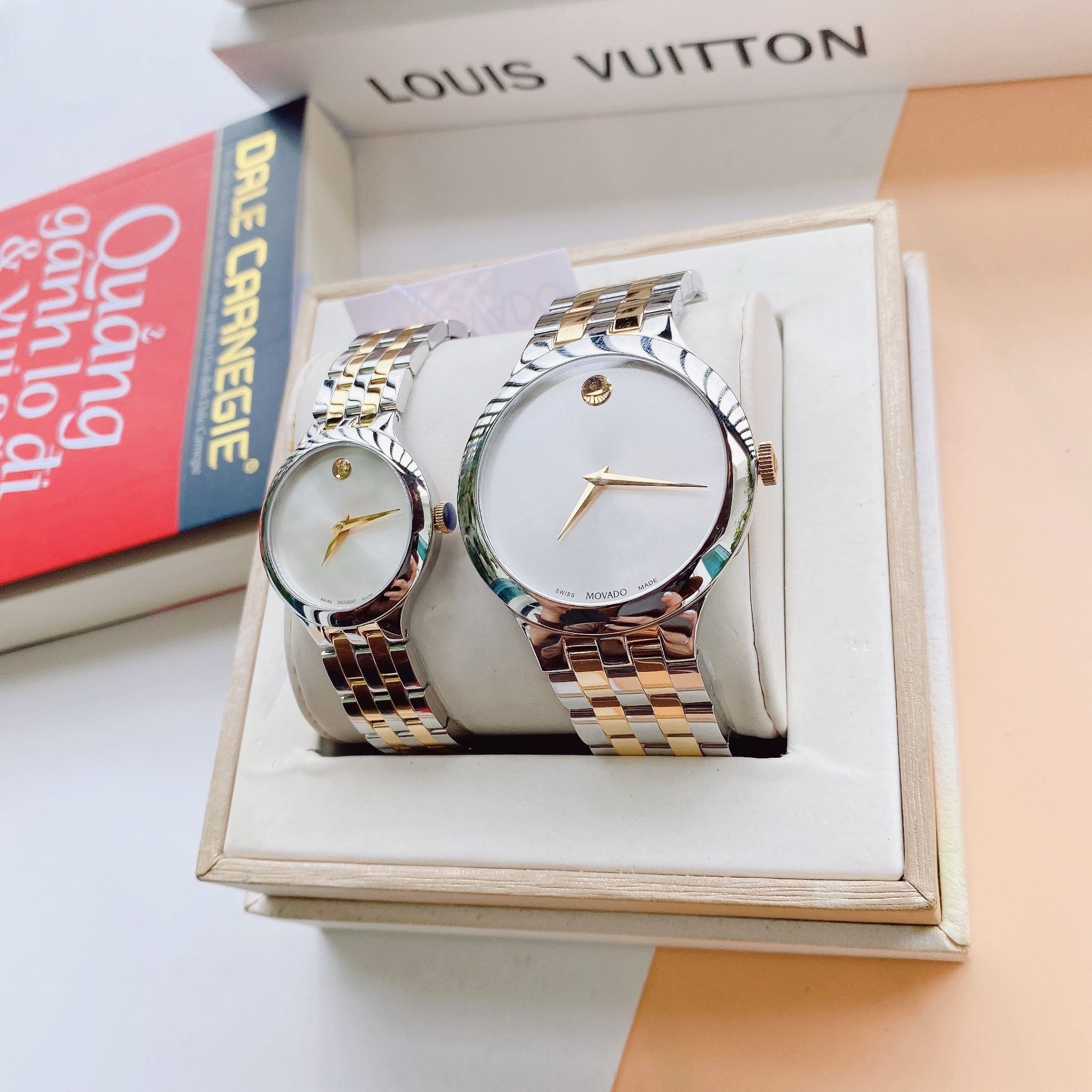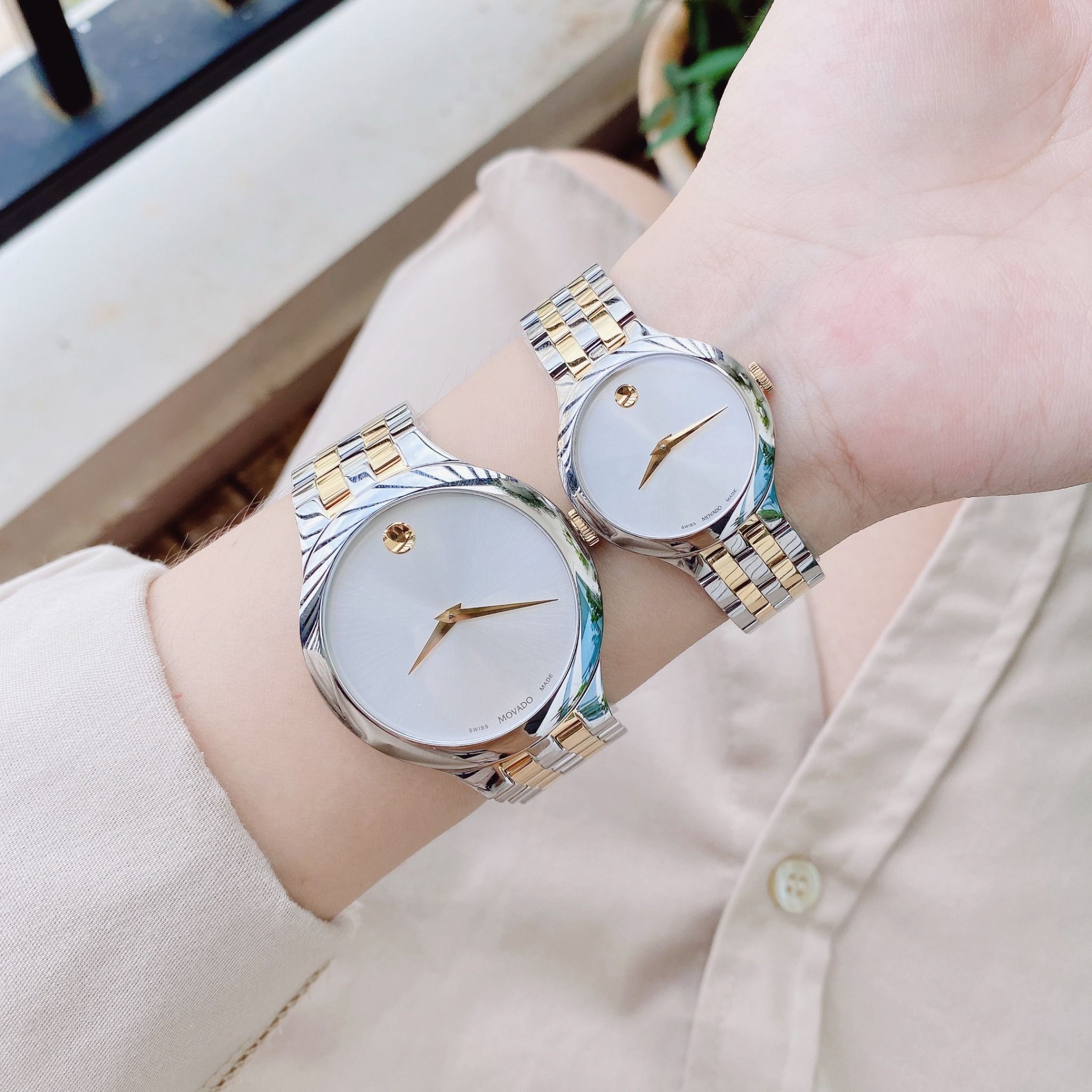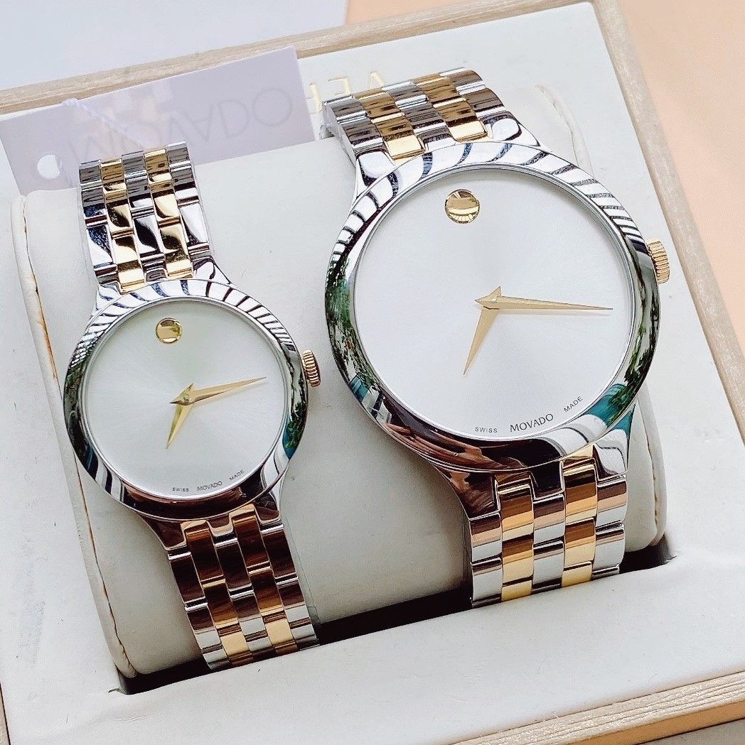 A - Movado Venturi Quartz Silver Dial 0607495 và 0607496 - Đồng Hồ Cặp