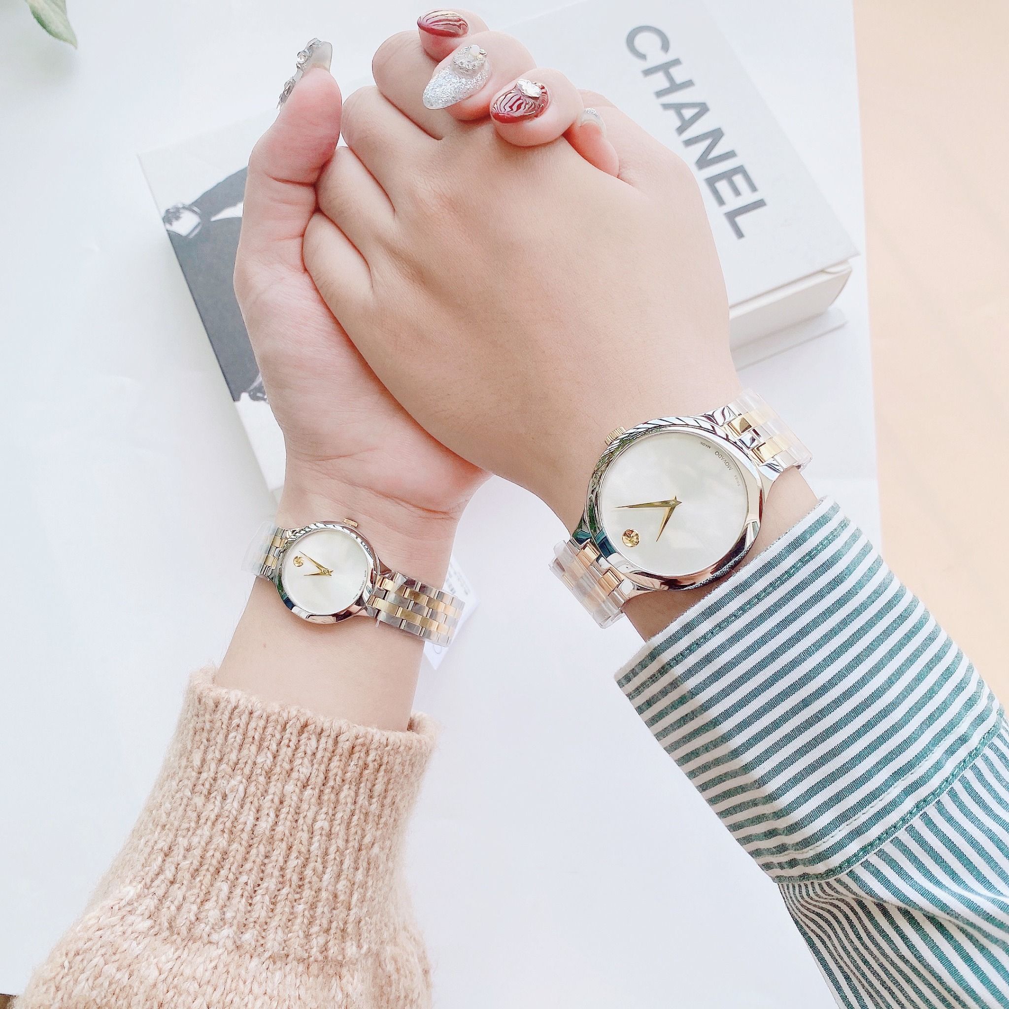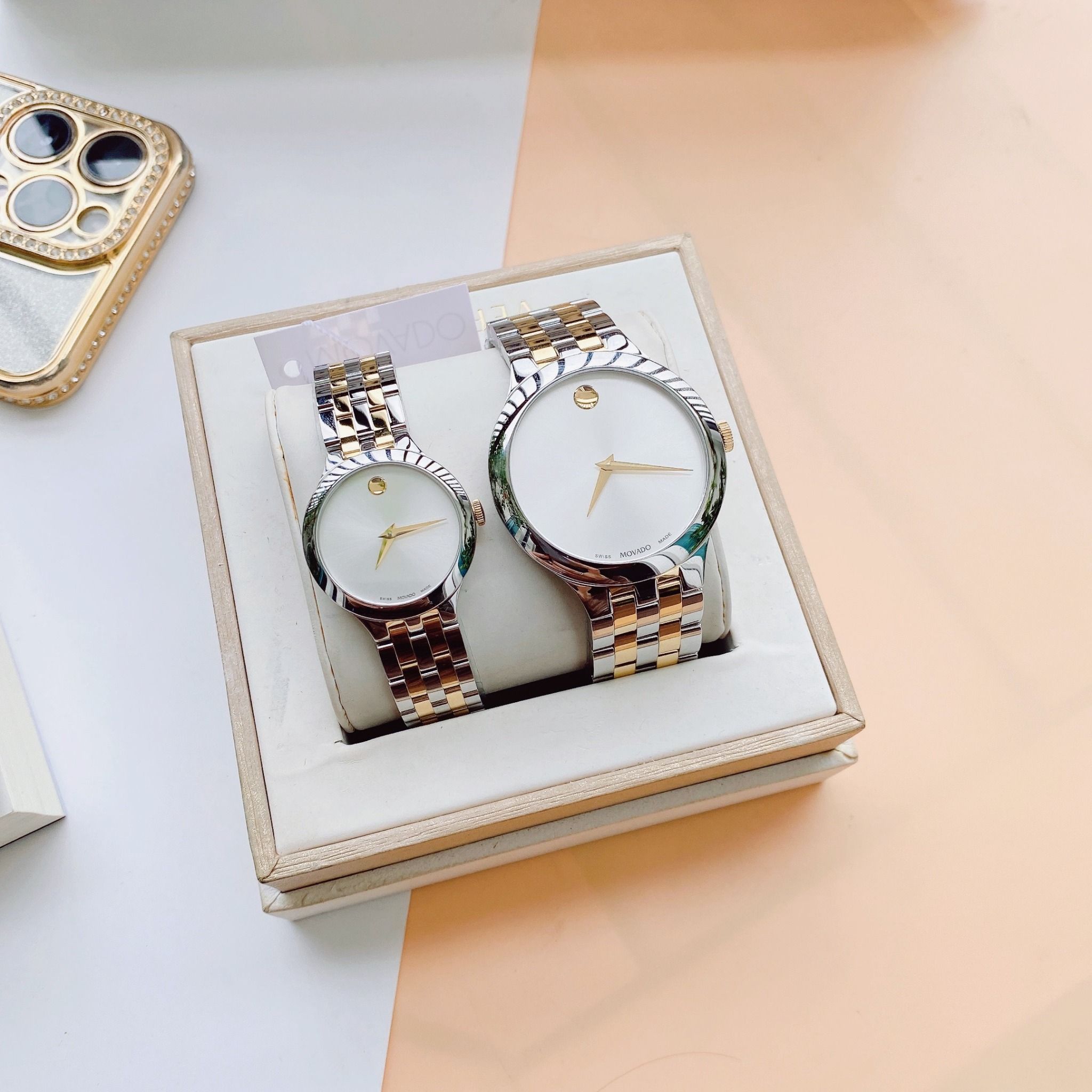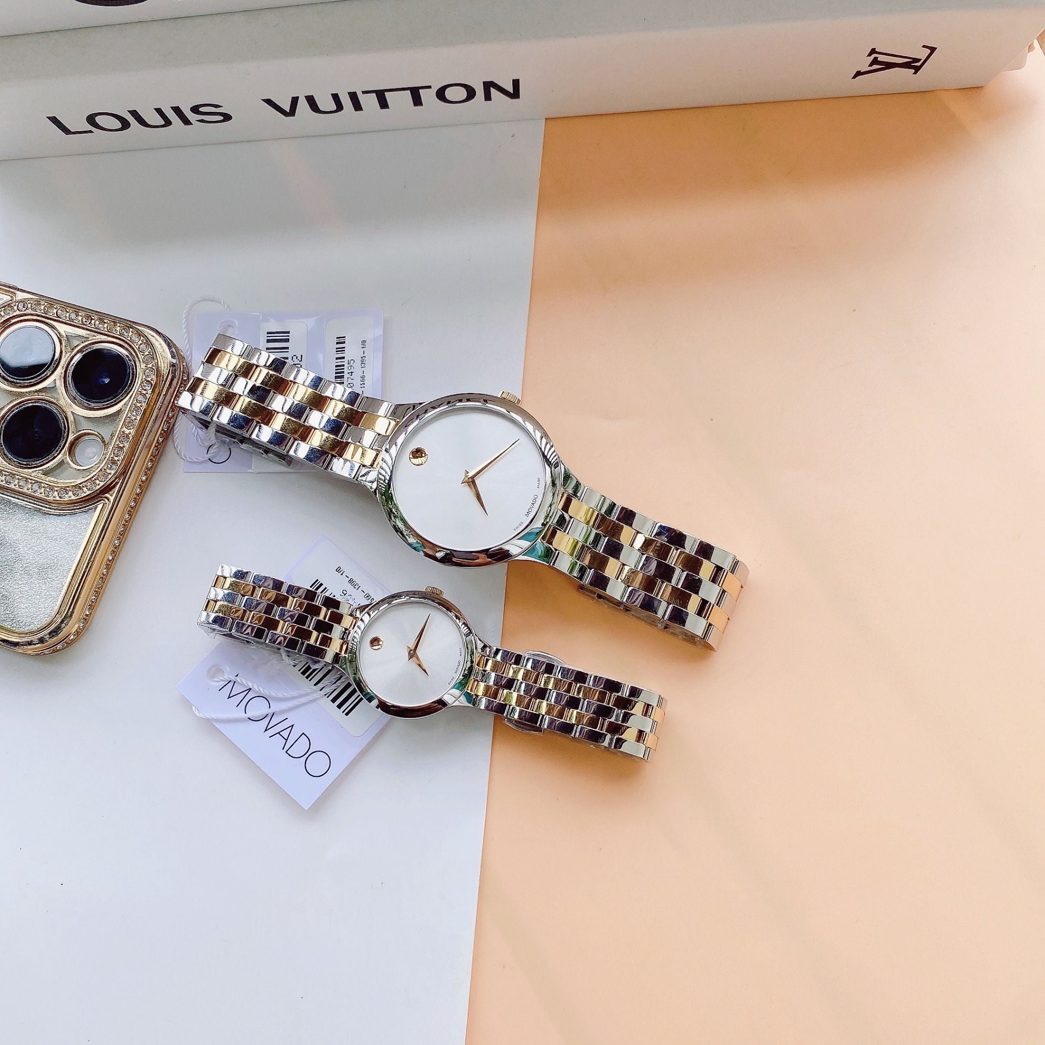 A - Movado Venturi Quartz Silver Dial 0607495 và 0607496 - Đồng Hồ Cặp