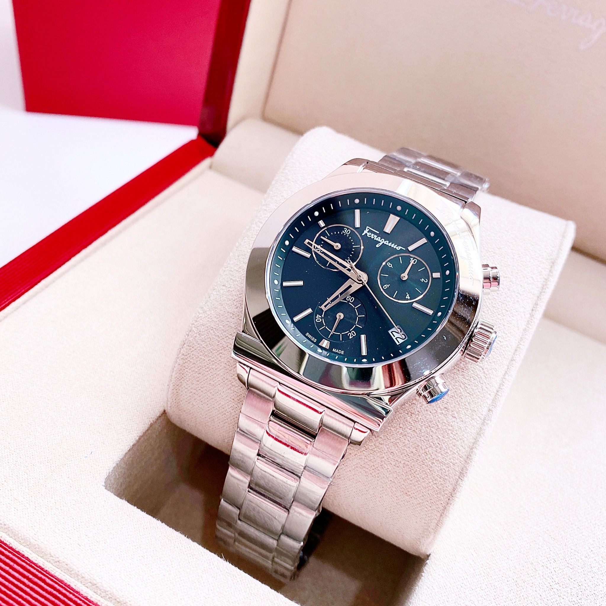Chất lượng được đảm bảo bởi lớp vỏ lì nam tính ấn tượng, mặt kính Sapphire Crystal chống trầy xước. Cảm hứng thiên nhiên thể hiện qua sắc xanh đậm của bầu trời đêm vô cùng đẹp mắt. Ferragamo 1898 là tổng hòa của kĩ thuật chế tác Thụy Sĩ và thiết kế tỉ mỉ đến từng chi tiết của nhà mốt. Các chức năng cơ bản: Ngày – Giờ – Phút – Giây được đều khiển một cách bền bỉ bởi cỗ máy Quartz Ronda 5040D với độ bền bỉ và chính xác cao.