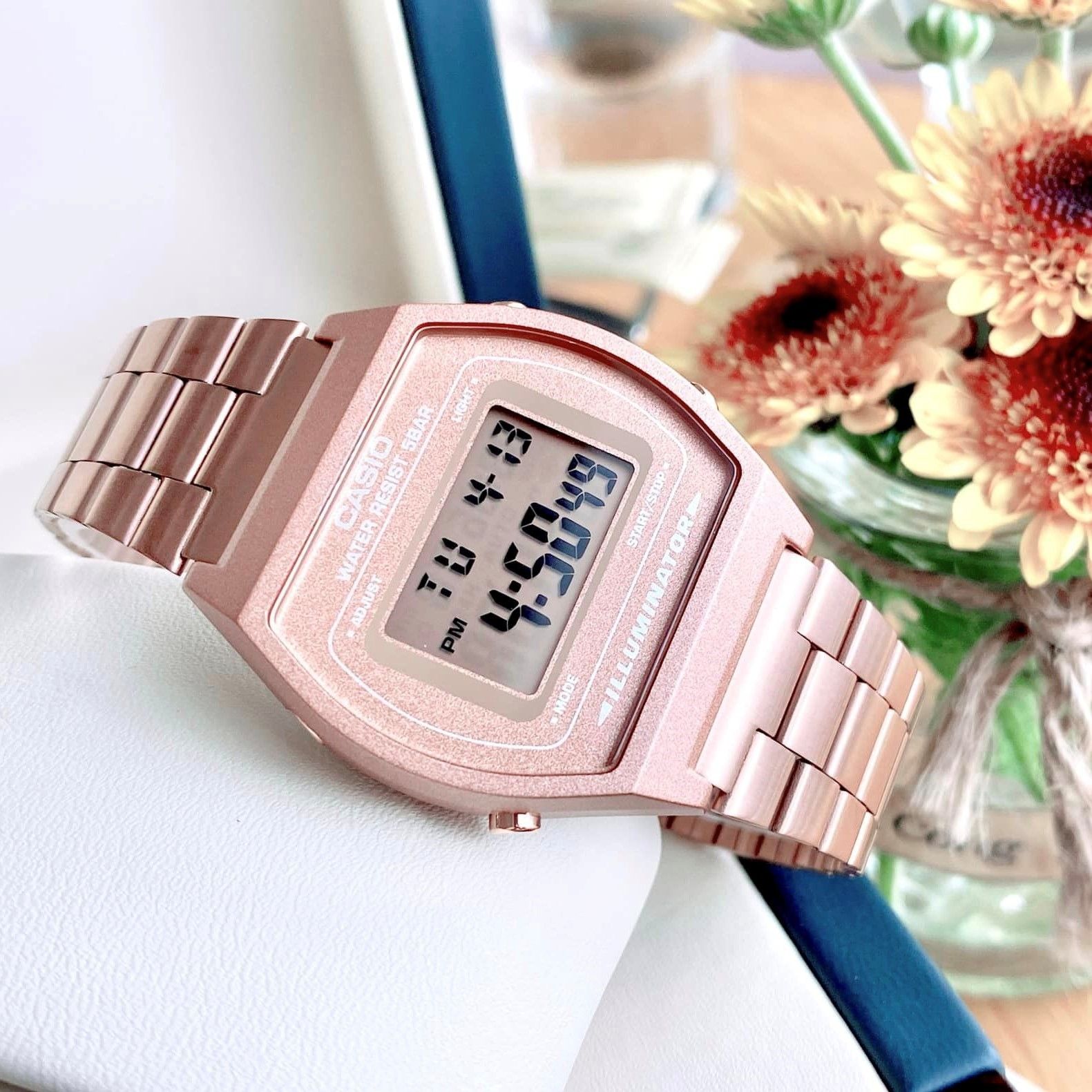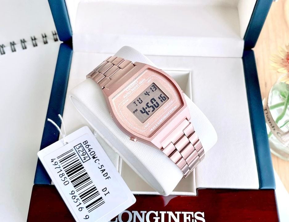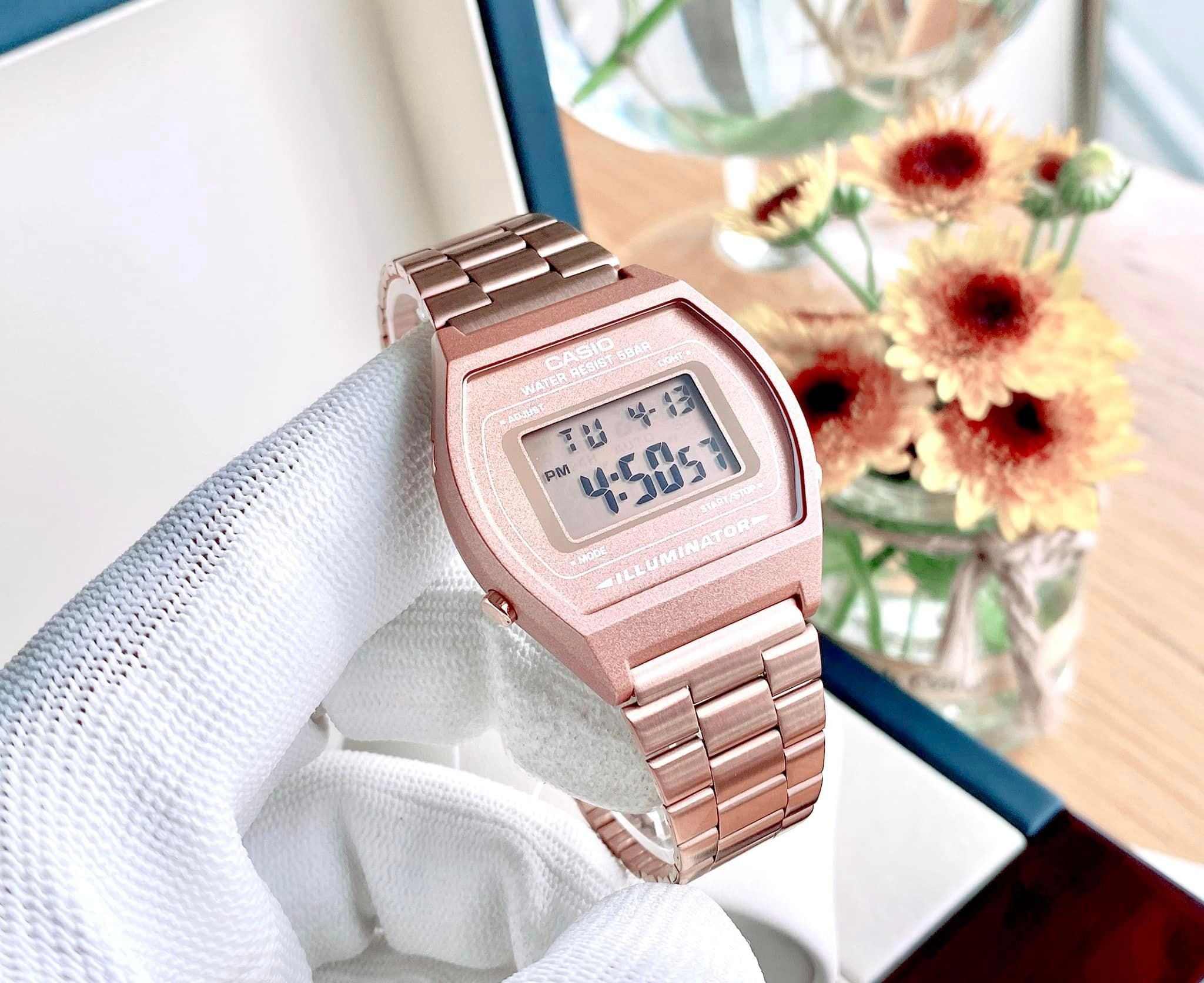 - Mẫu Casio Vintage rose gold dành cho các fan trẻ năng động với mặt số điện tử với nhiều chức năng mang lại nhiều tiện ích cho người dùng, tạo nên phong cách cá tính với bộ dây đeo bằng kim loại mạ vàng hồng