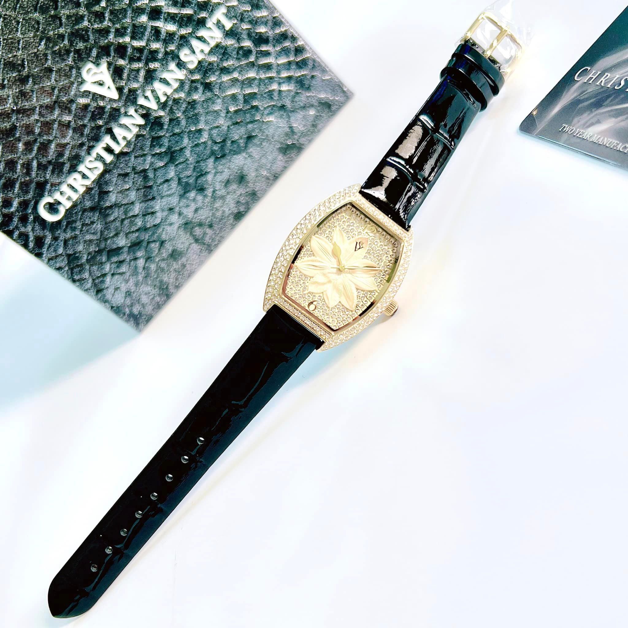 Christian Van Sant Lotus Quartz Swarovski Gold Dial Black Leather CV4855 - Đồng Hồ Nữ