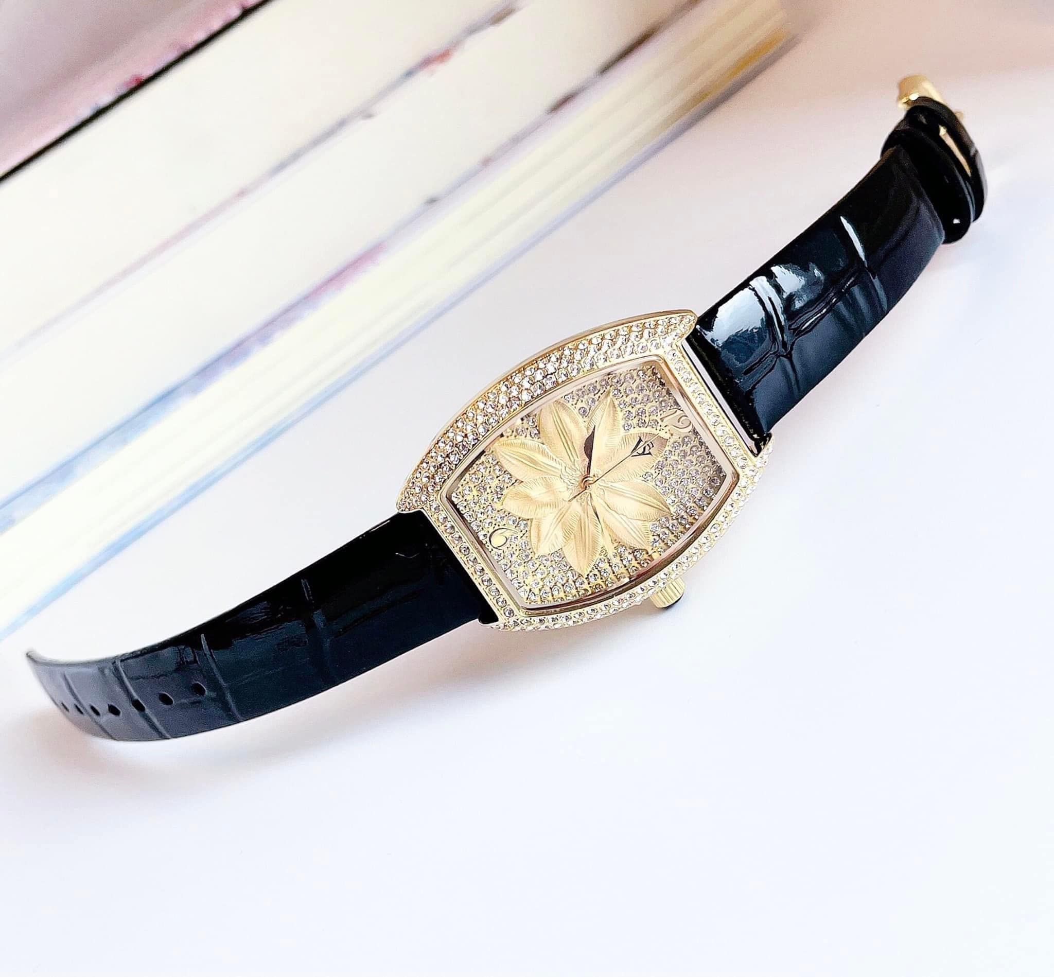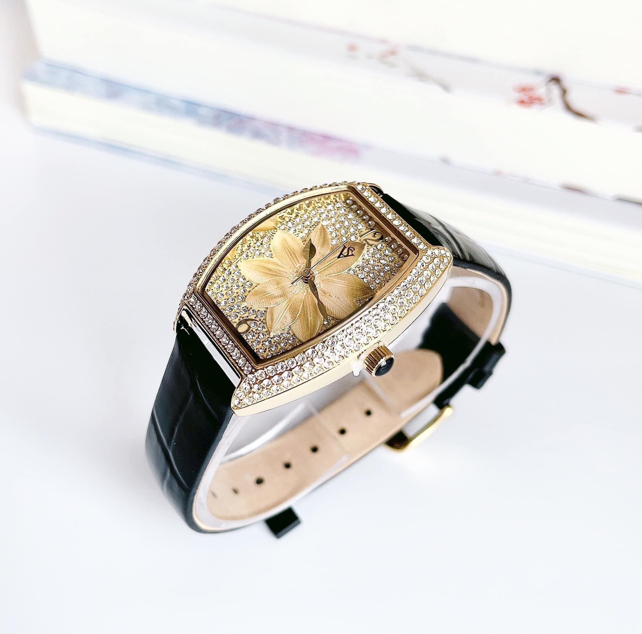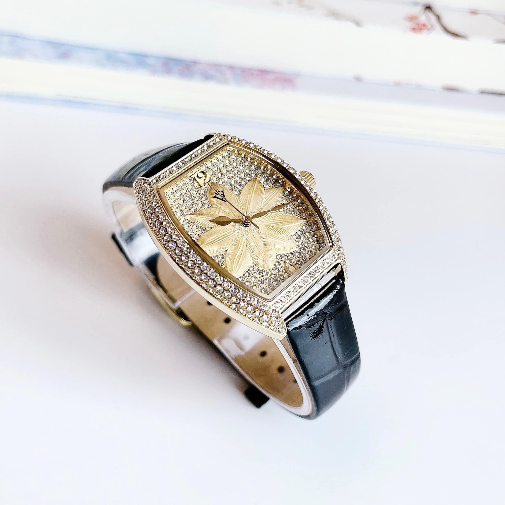 • Viền kim loại màu gold được đính full đá swa - Núm chỉnh giờ gắn đá quý