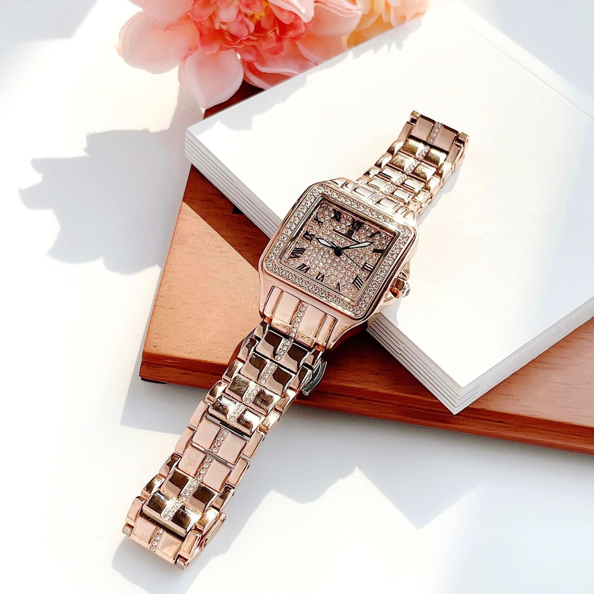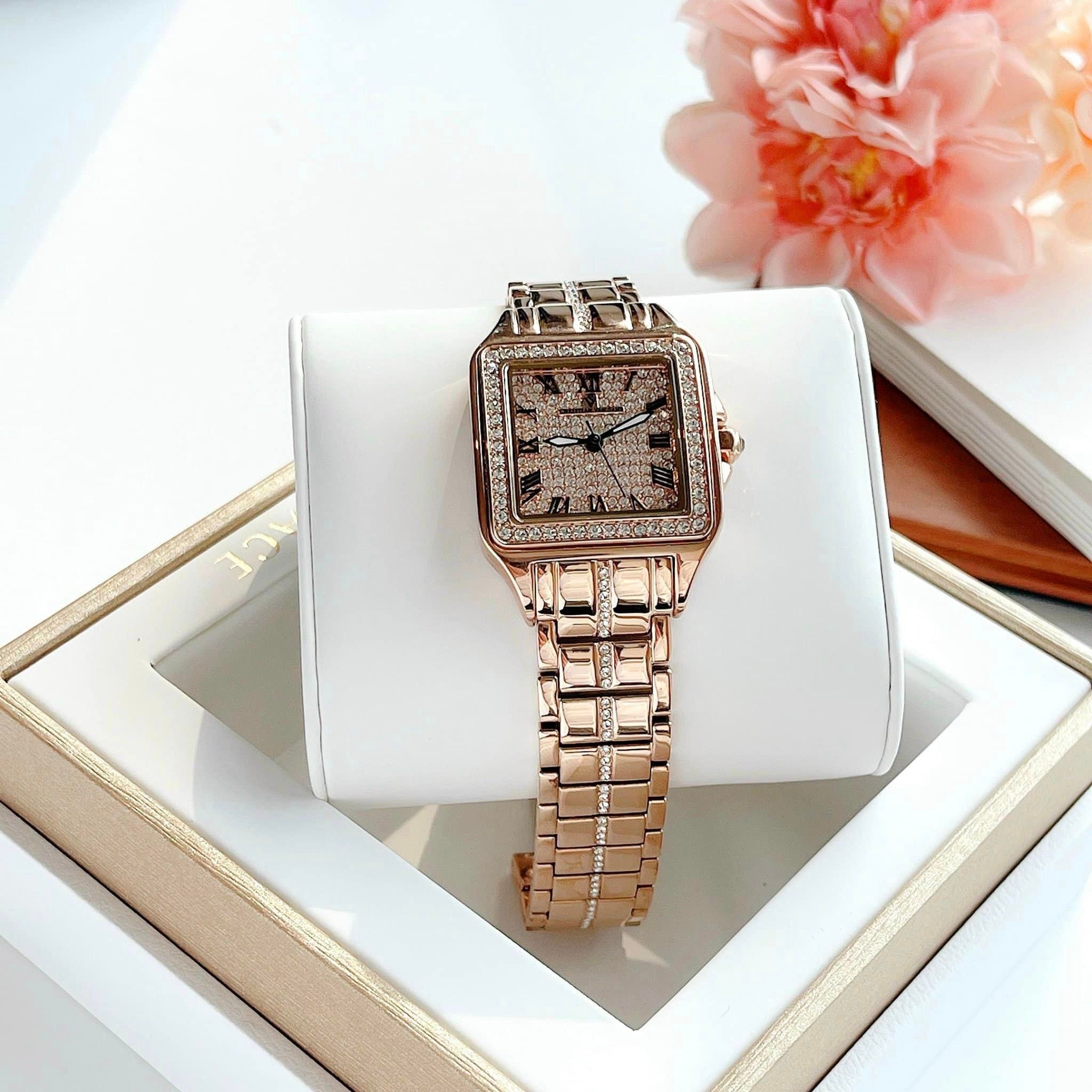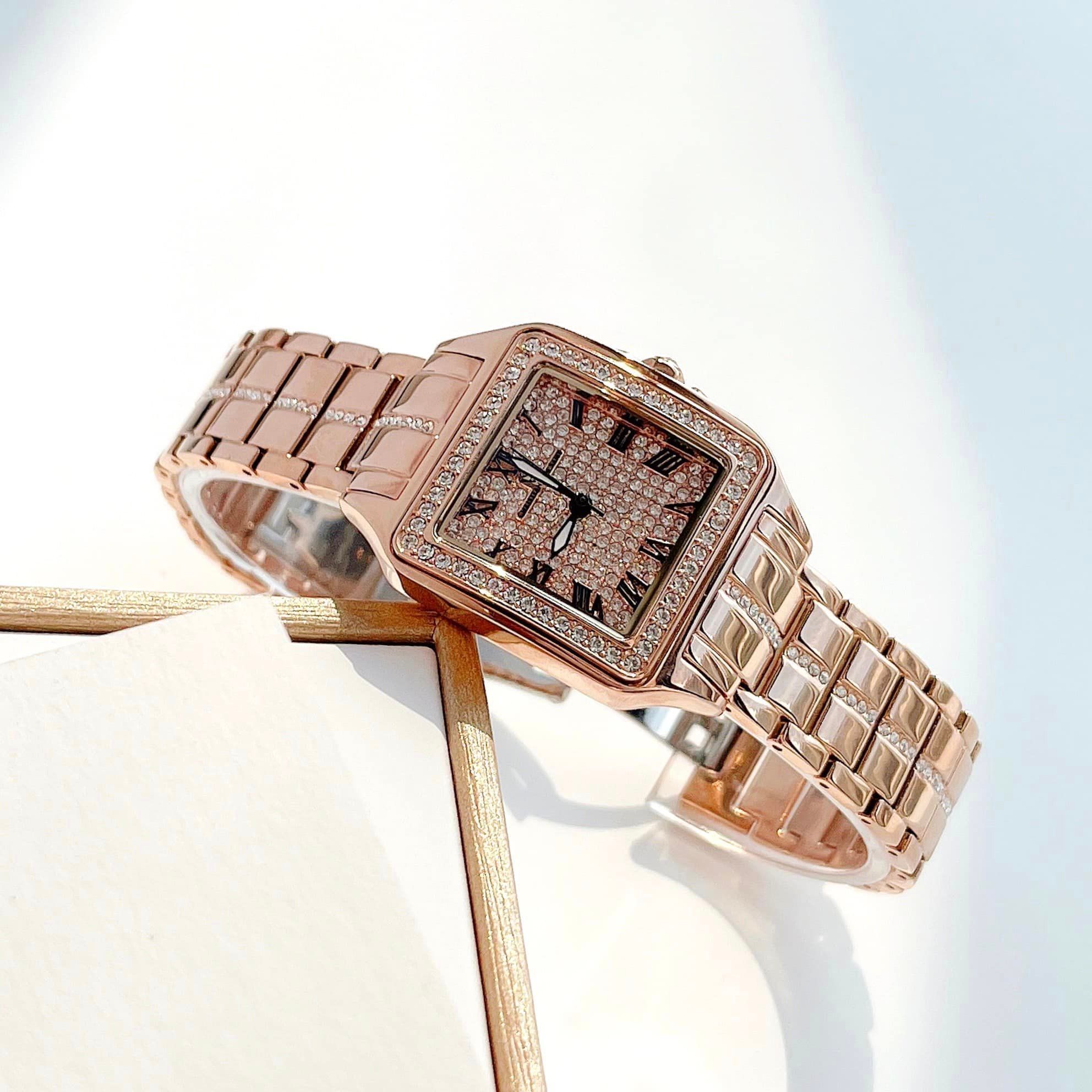• Mặt hình vuông và viền kim loại màu rose gold gắn full đá lấp lánh