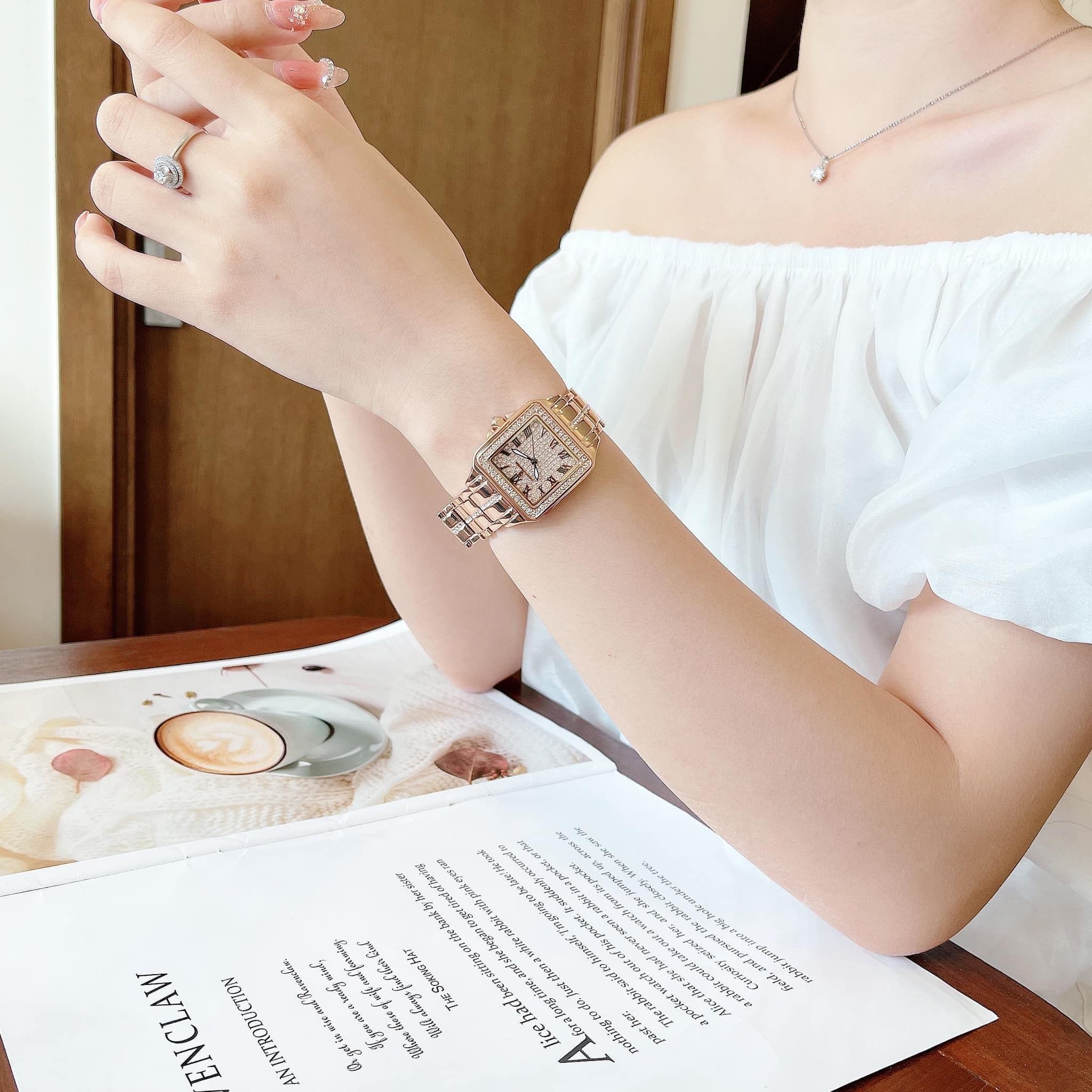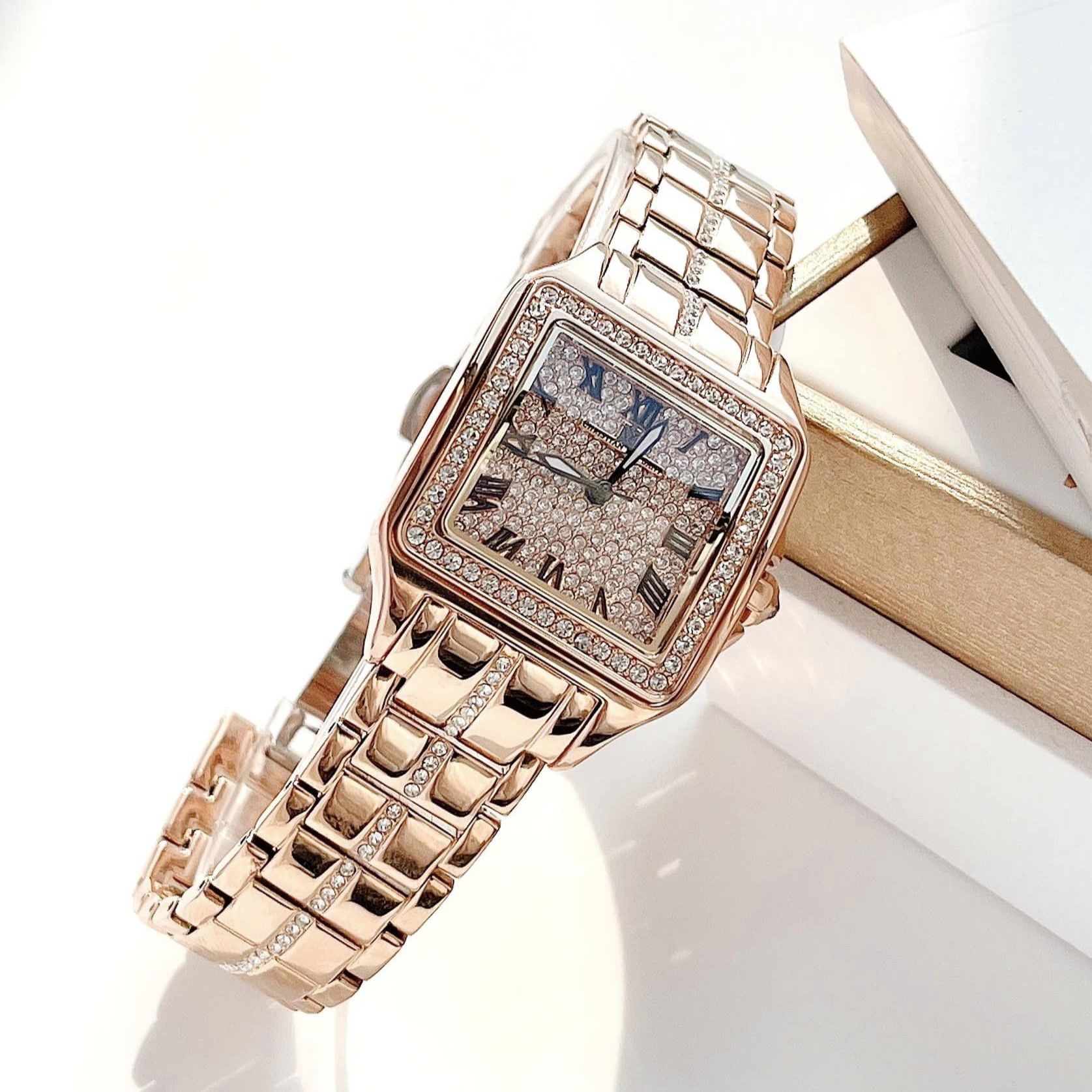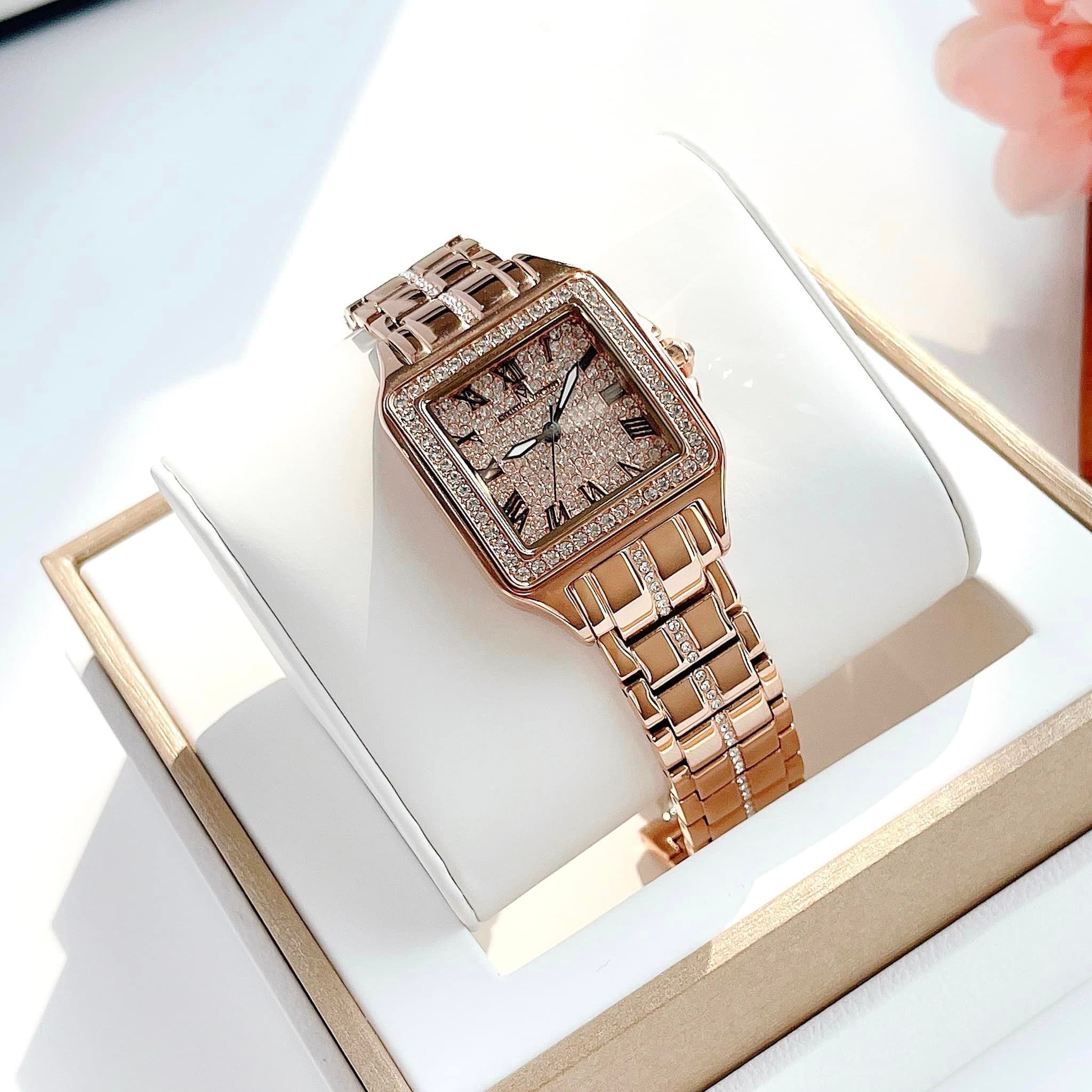 • Mặt hình vuông và viền kim loại màu rose gold gắn full đá lấp lánh