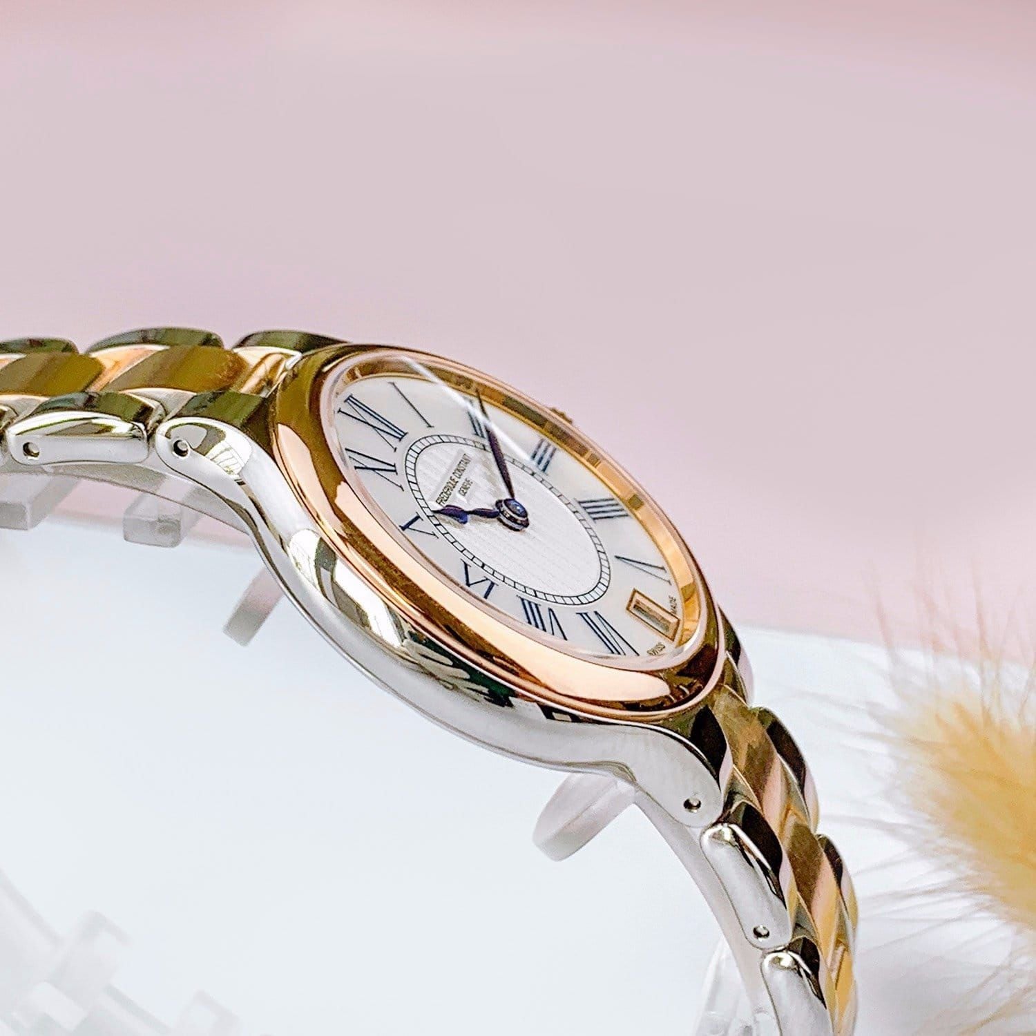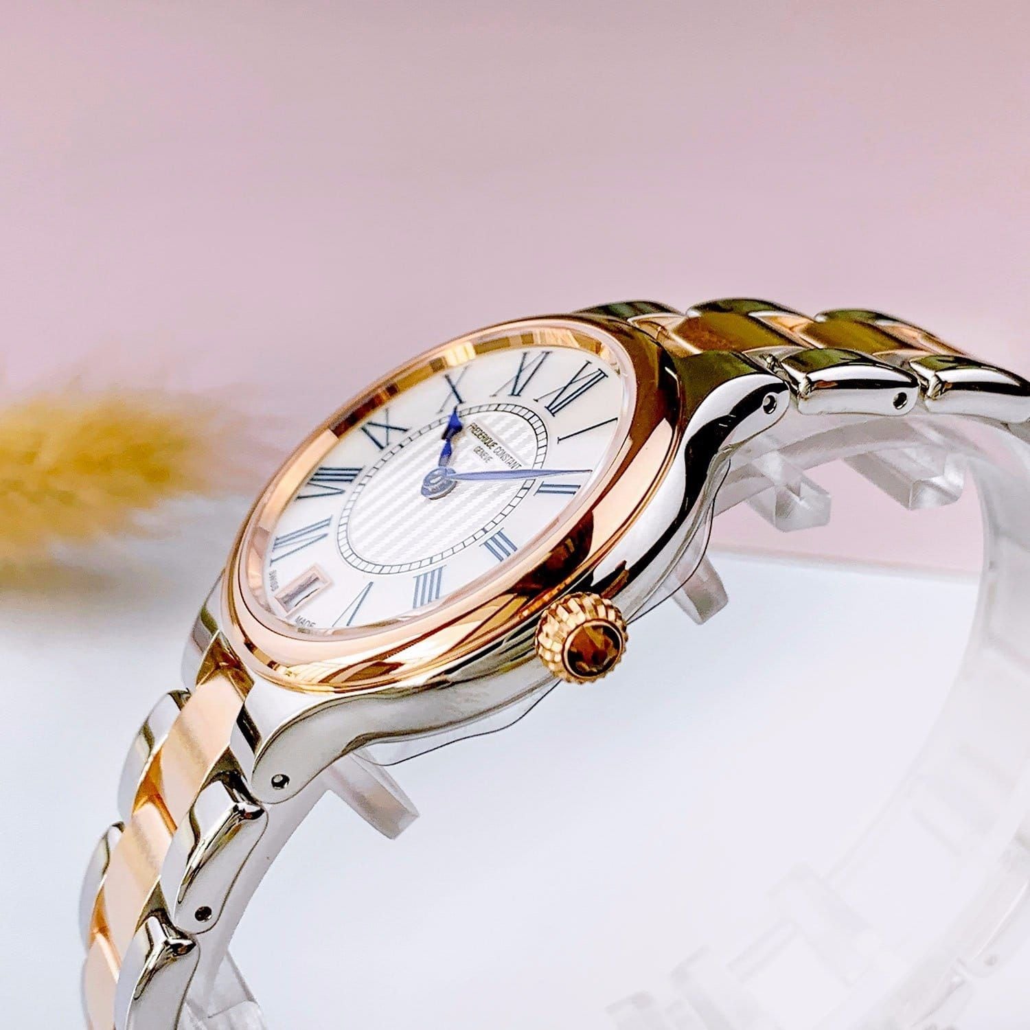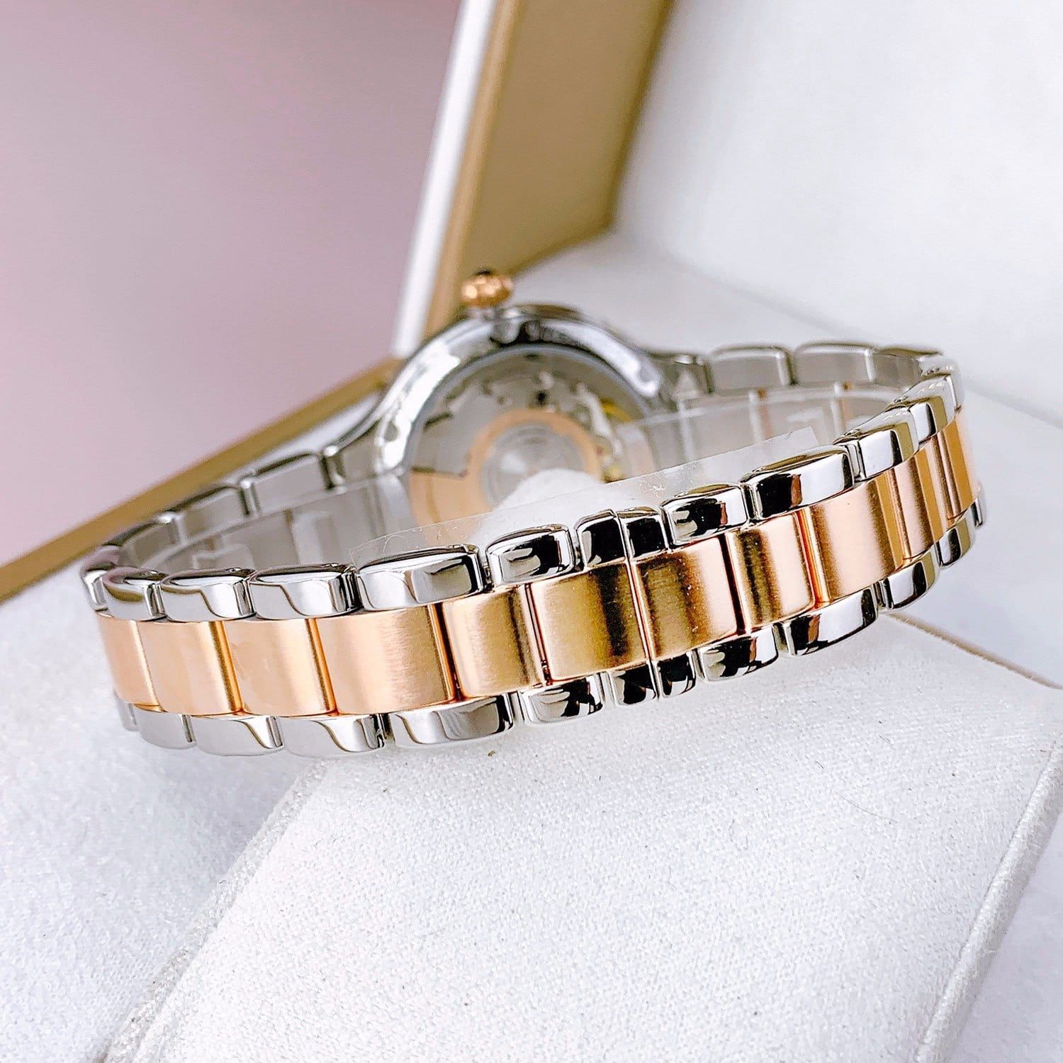 - Viền, vỏ và dây làm bằng thép chống gỉ cao cấp 316L kết hợp mạ vàng hồng PVD.