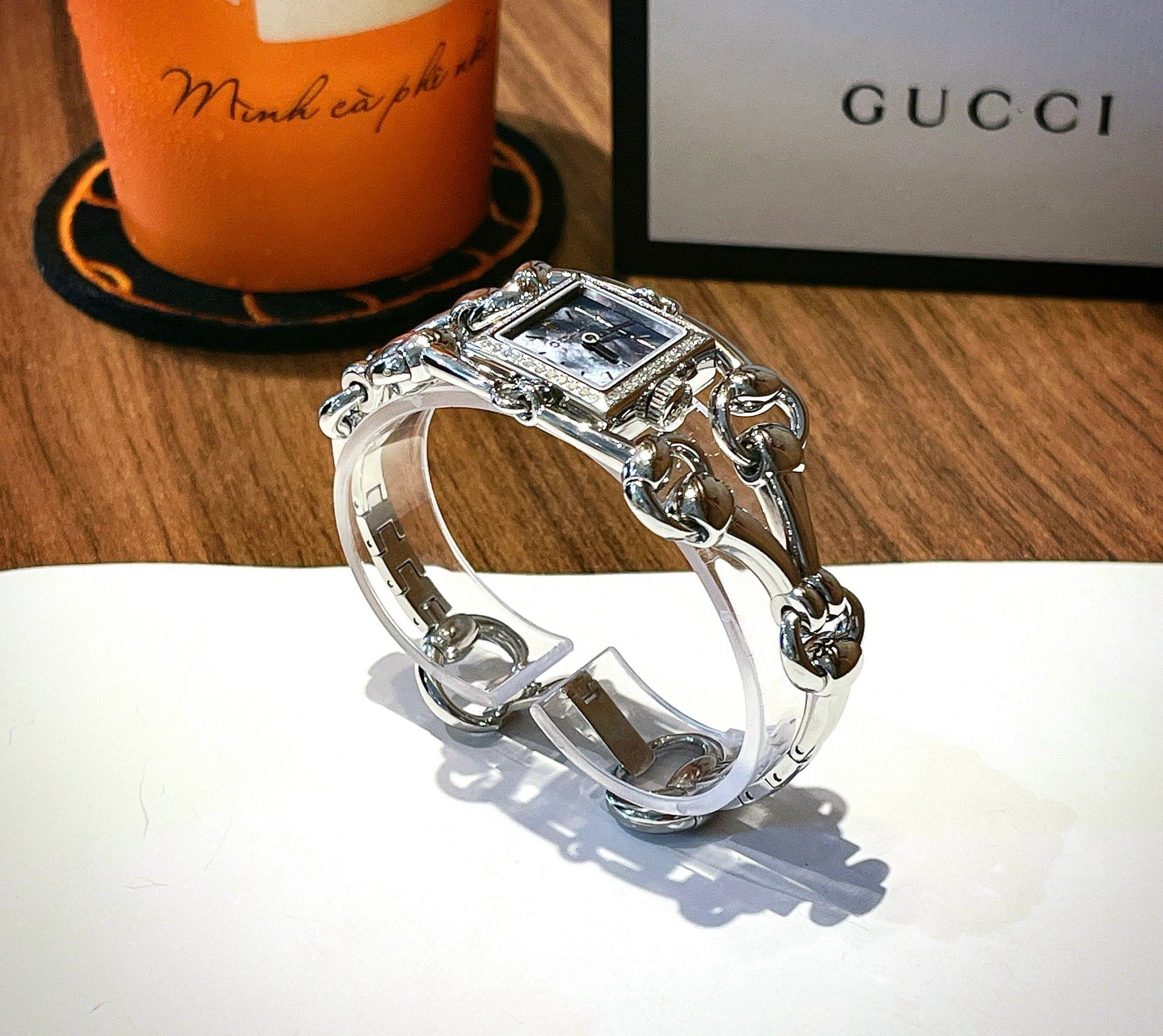 • Được thiết kế theo kiểu dáng lắc tay nhưng lại hoàn toàn đặc biệt, với mặt đồng hồ khảm ngọc trai xanh lấp lánh như hình đôi mắt với con ngươi hình vuông bé xinh, vừa nữ tính lại vừa cá tính