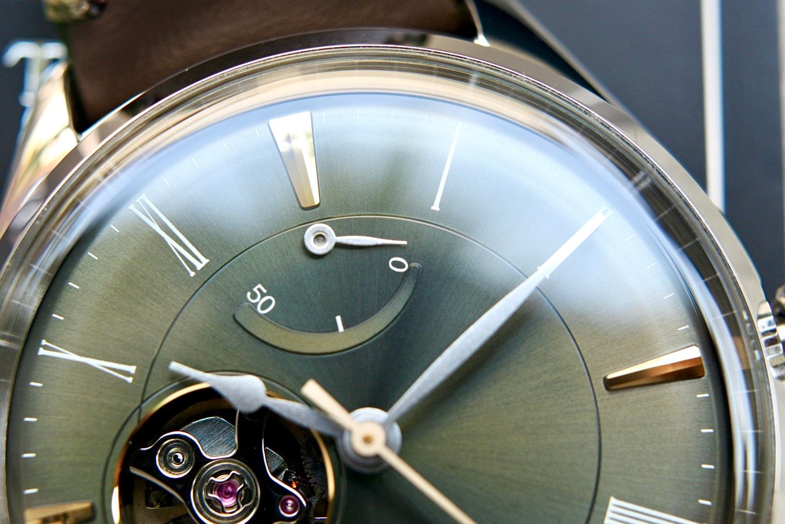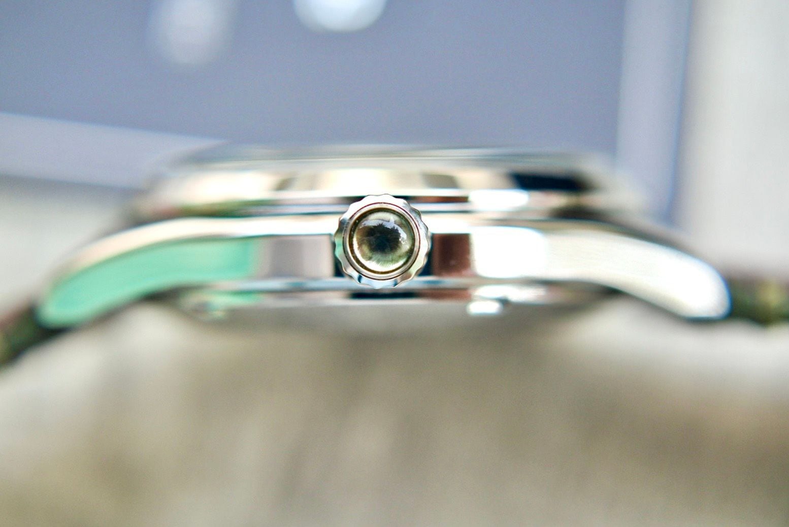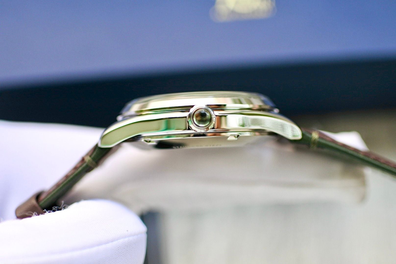 Ấn tượng với thiết kế mặt Dial xanh rêu cực lạ, tạo phong cách trẻ trung năng động kết hợp với một hột ngọc màu xanh rêu nhạt ngay núm chỉnh giờ làm tăng thêm độ sang trọng.