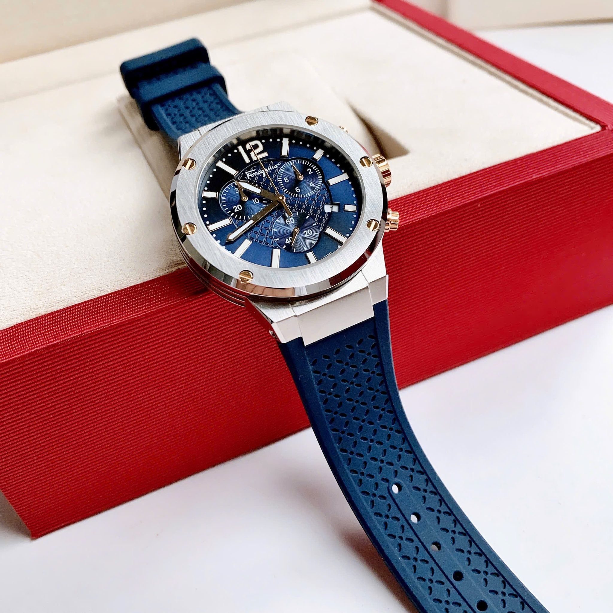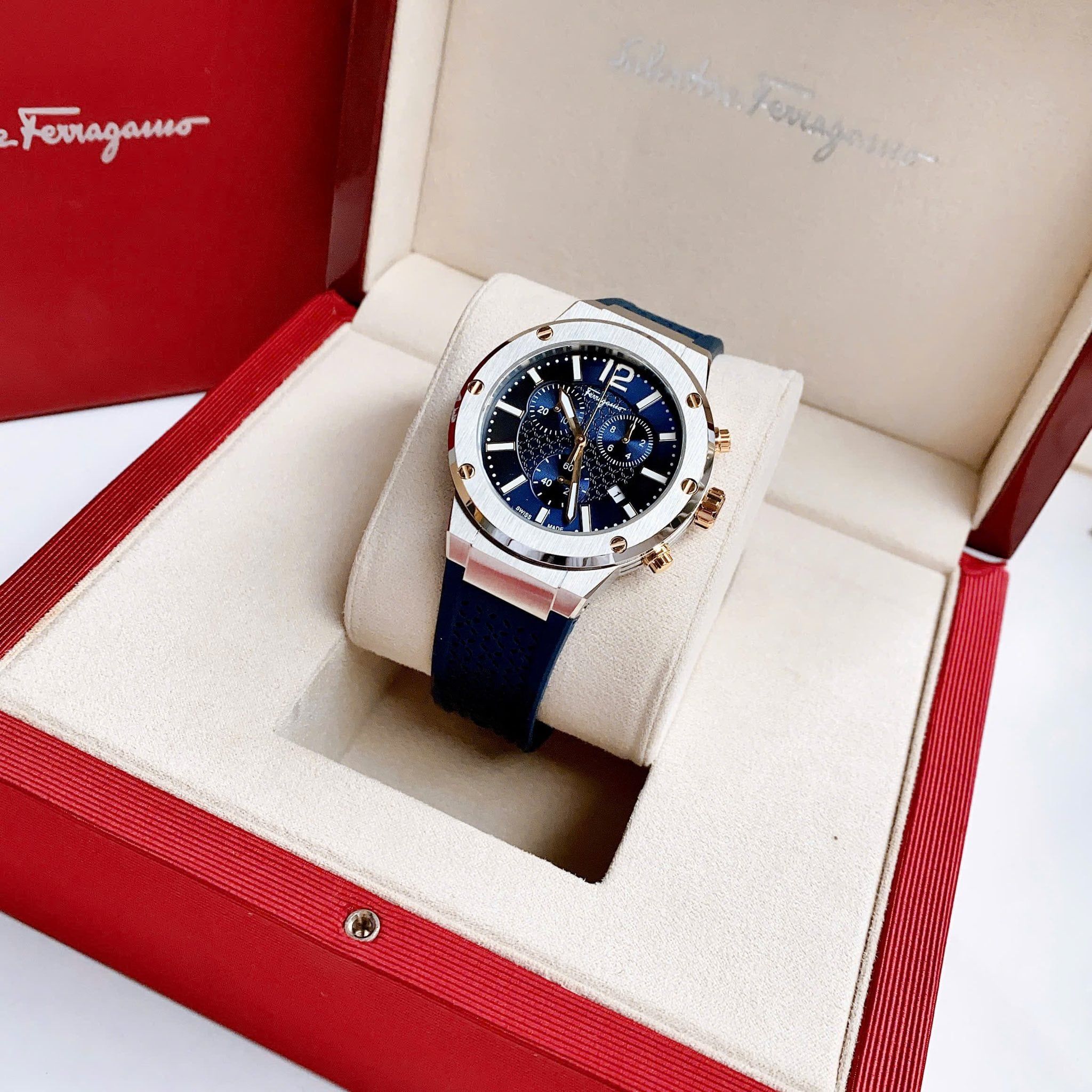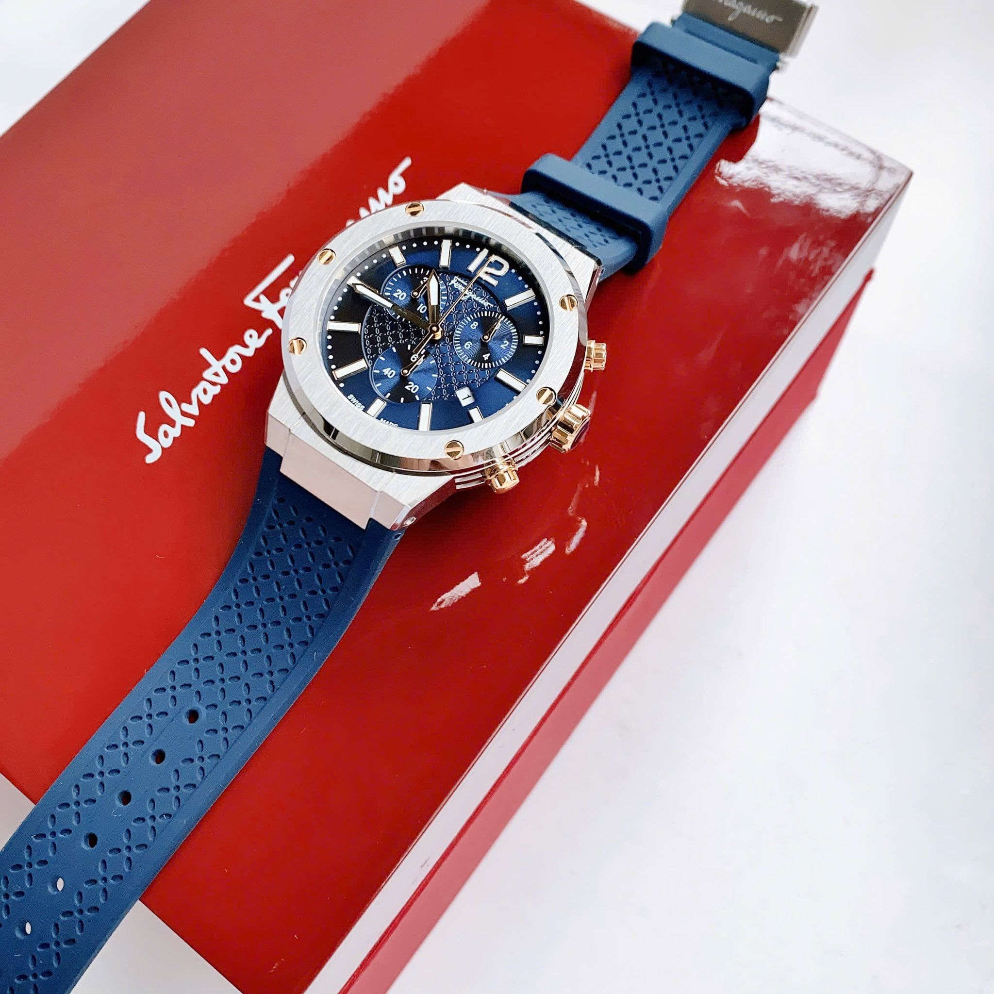 Là phiên bản mới có mặt trên thị trường , được kế thừa từ phiên bản nam F80 bán chạy nhất của Salvatore Ferragamo bởi phong cách thể thao và nam tính. được thiết kế với màu Xanh cùng với tone màu bạc của viền bezel, vỏ đồng hồ làm từ thép không gì 316L. Với tính năng Chronograph, chiếc đồng hồ trở thành item đáng sở hữu dành cho khách hàng ưa thích hoạt động thể thao vì khả năng đo đếm chính xác tuyệt đối