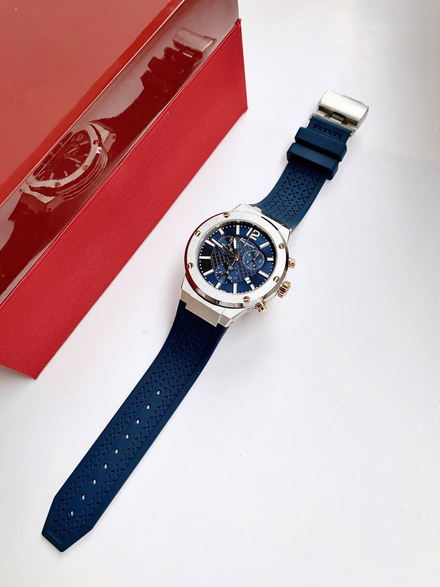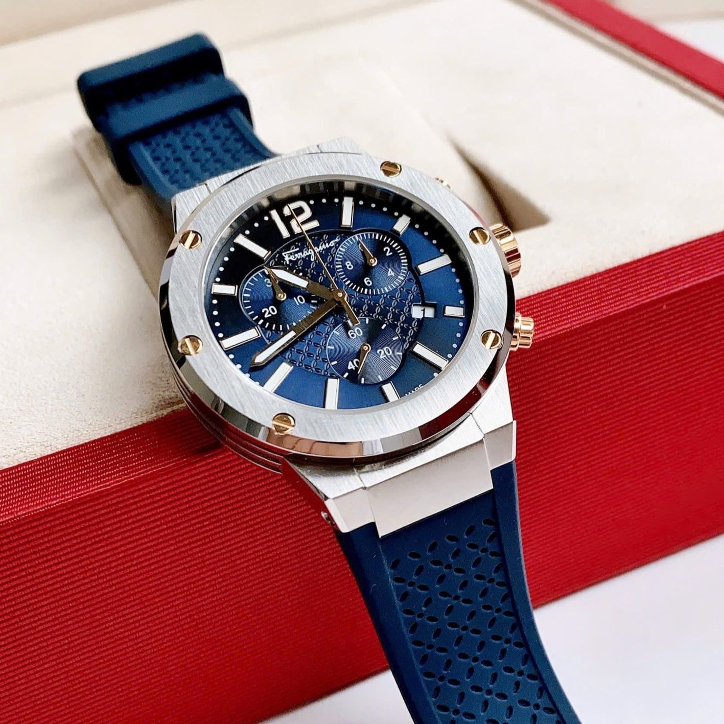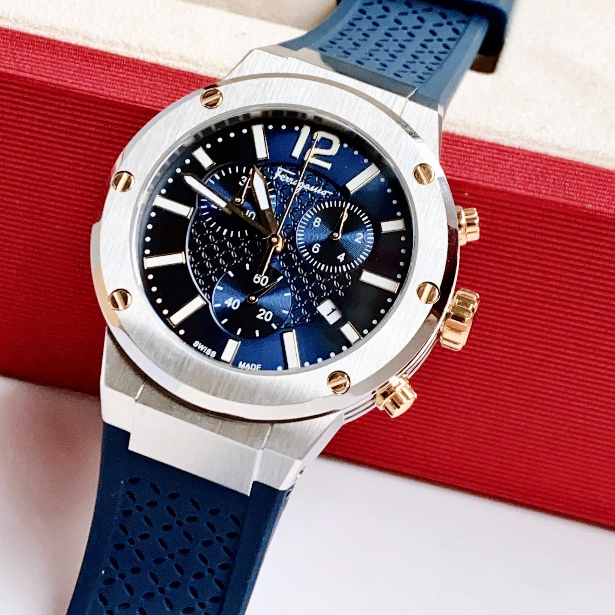 Là phiên bản mới có mặt trên thị trường , được kế thừa từ phiên bản nam F80 bán chạy nhất của Salvatore Ferragamo bởi phong cách thể thao và nam tính. được thiết kế với màu Xanh cùng với tone màu bạc của viền bezel, vỏ đồng hồ làm từ thép không gì 316L. Với tính năng Chronograph, chiếc đồng hồ trở thành item đáng sở hữu dành cho khách hàng ưa thích hoạt động thể thao vì khả năng đo đếm chính xác tuyệt đối