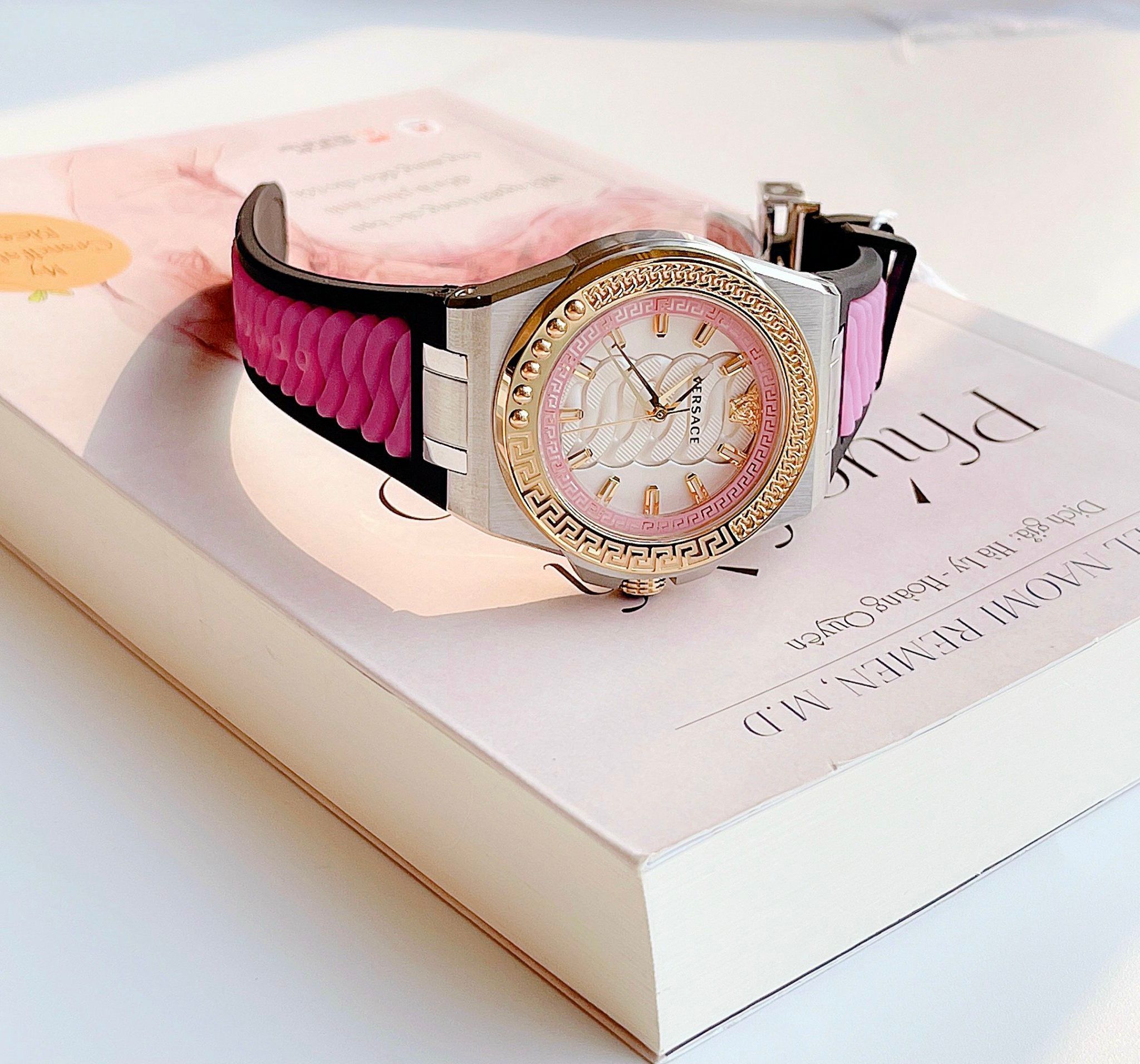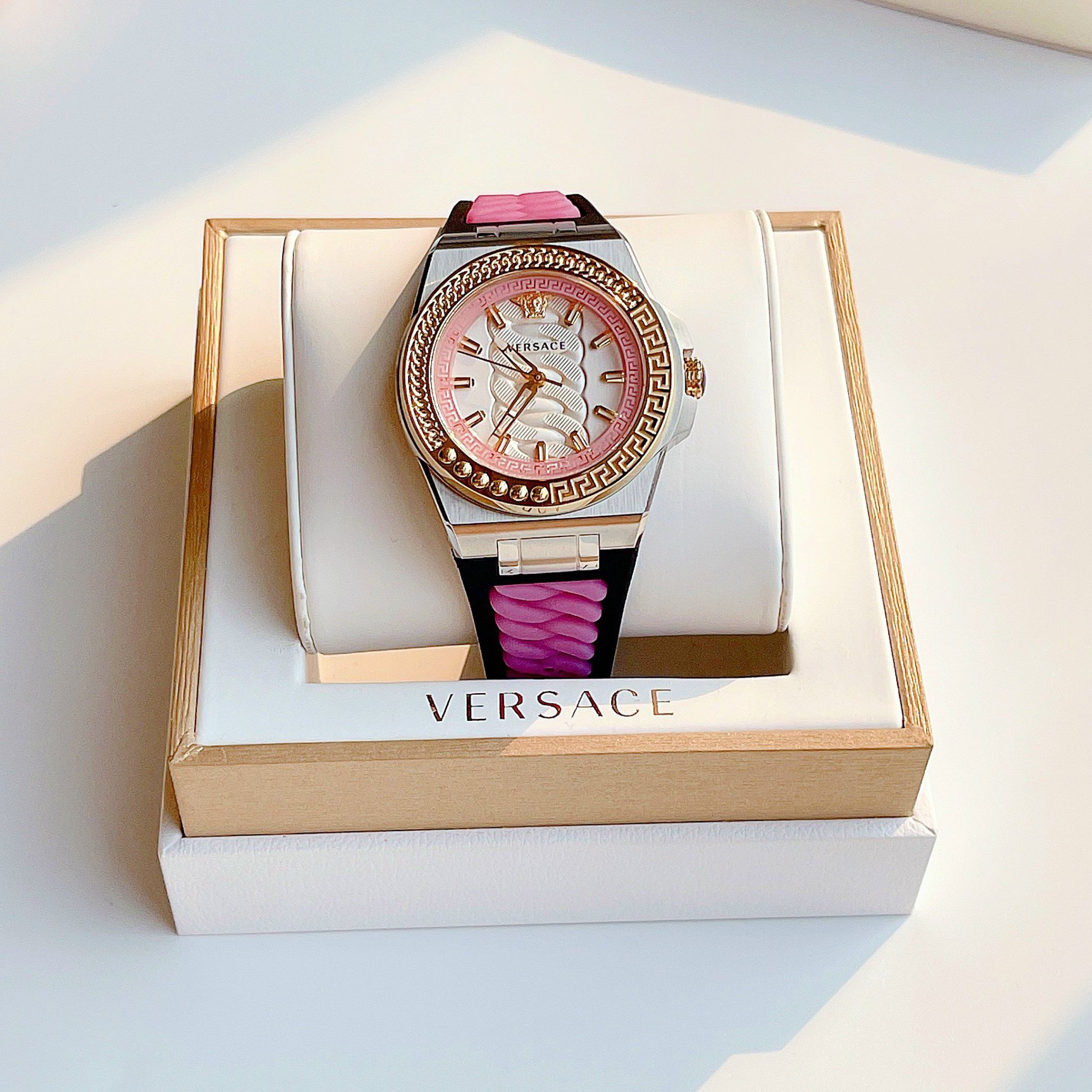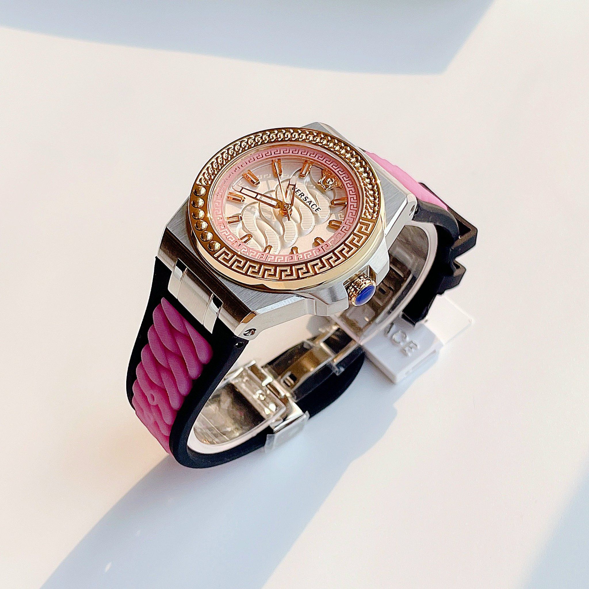 • Mặt logo Medusa và điểm giờ màu gold nổi bật trên nền đen và trắng khắc vân xoắn hình xích