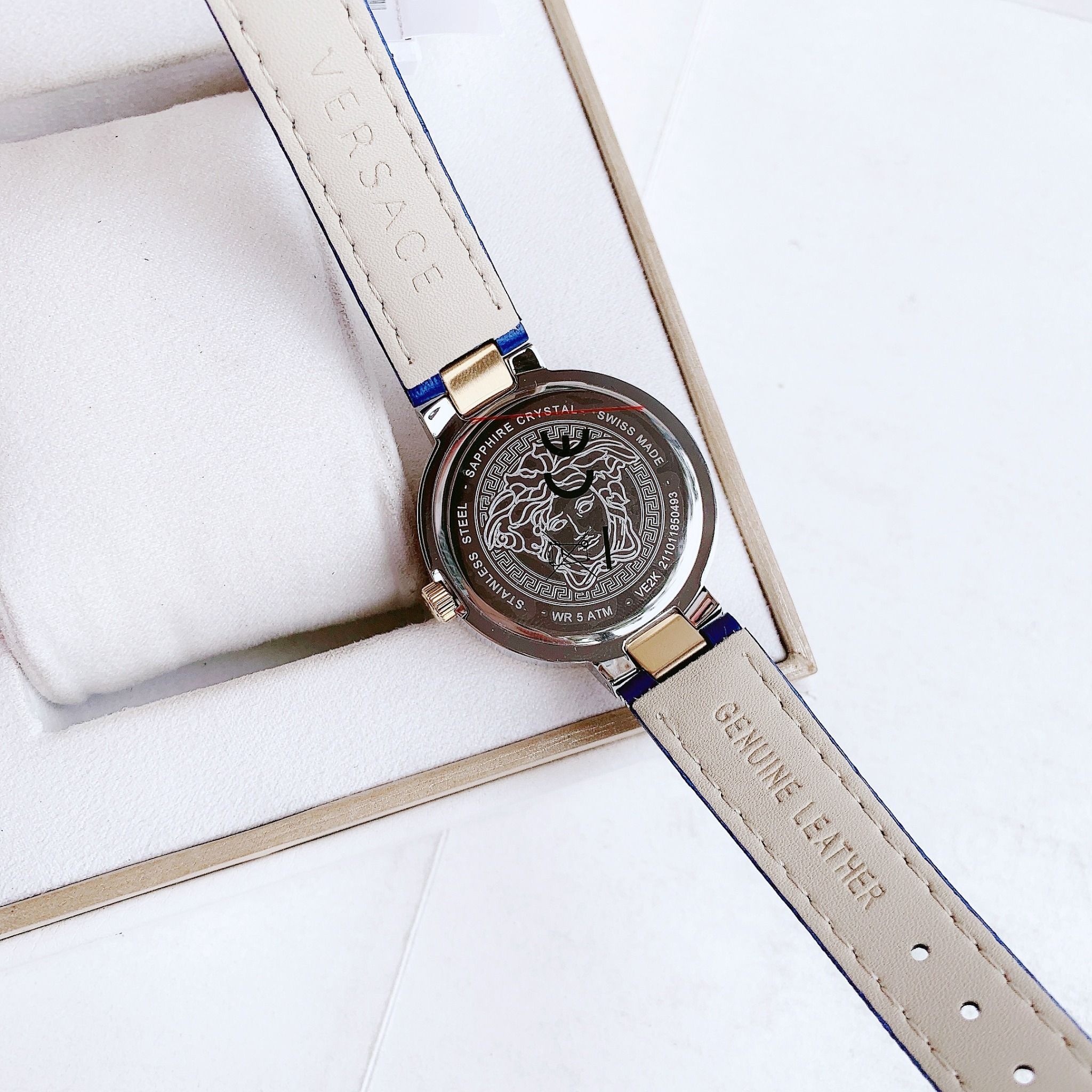 ▫️Mặt số xanh, nổi bật các cọc số vàng tiệp màu niềng và Logo Medusa tại điểm 12h